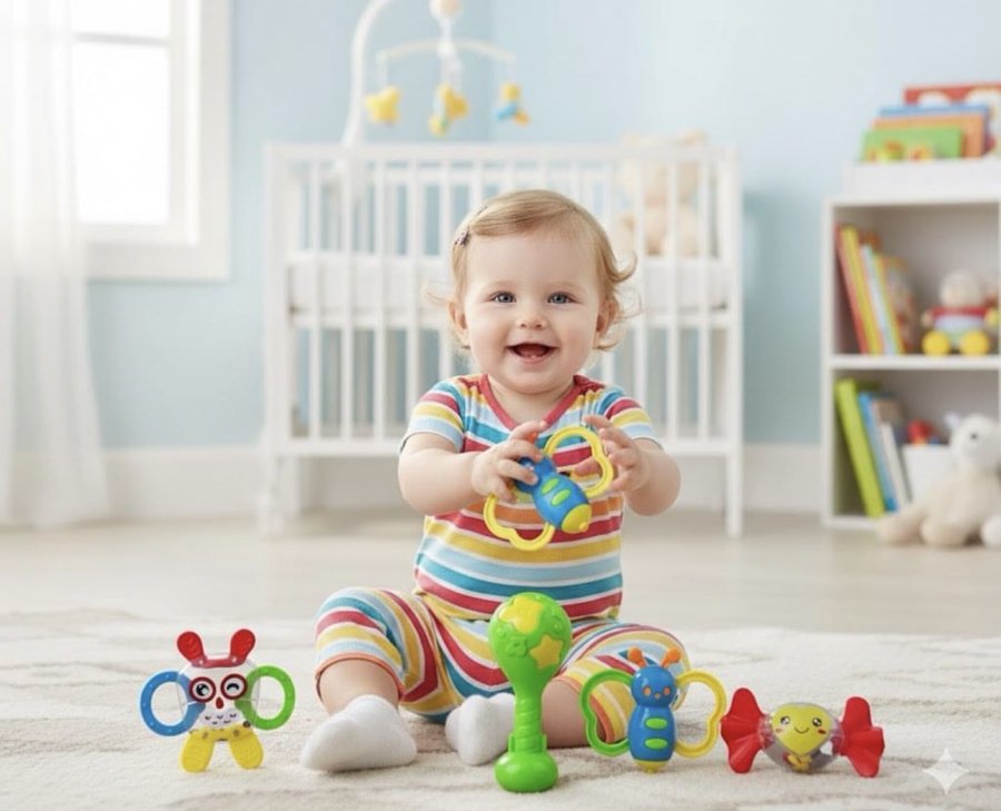 مجموعة جميلة من ألعاب الأطفال الملونة تساعد على تنمية حواس الطفل وتسلية الصغار بطريقة آمنة وممتعة 👶✨